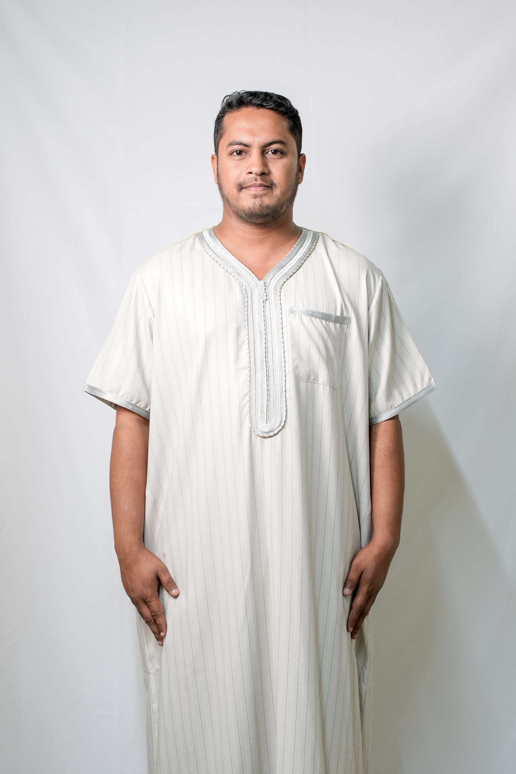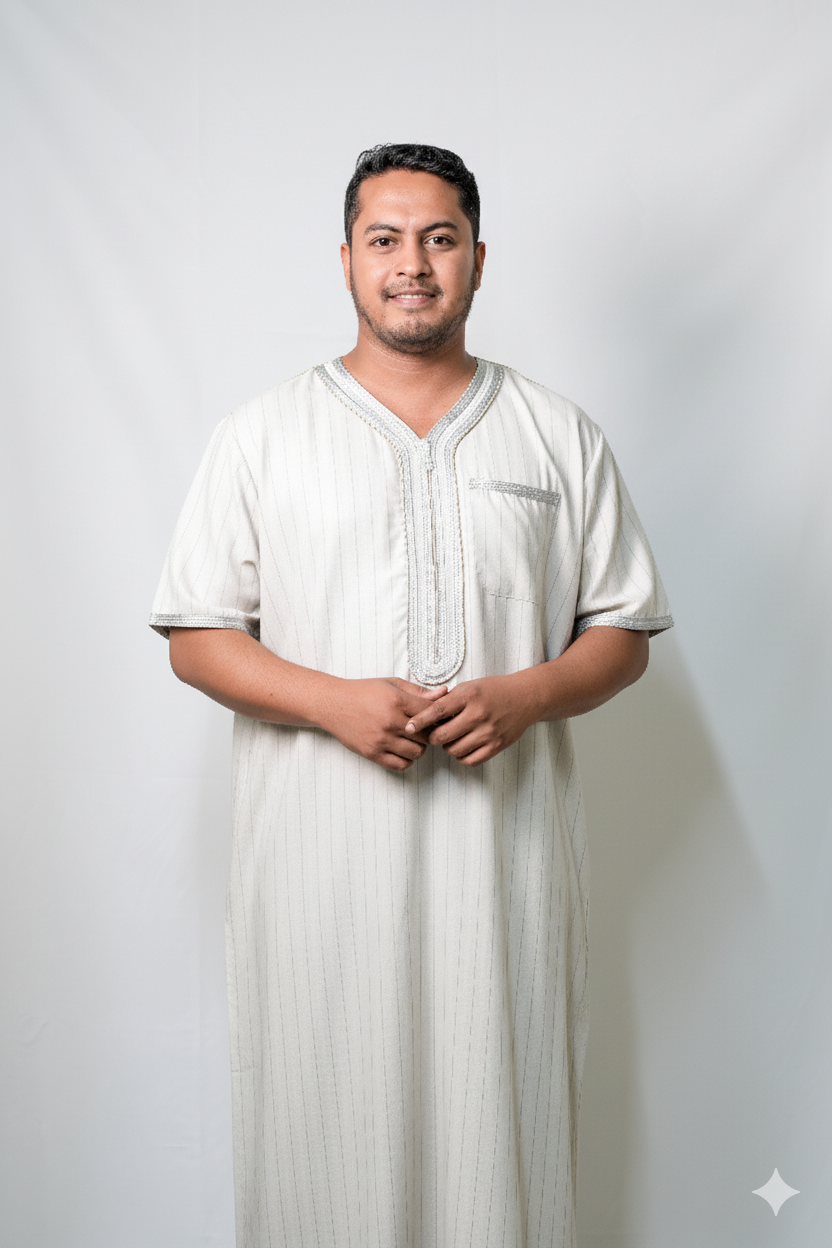 Crafted from a lightweight and breathable fabric (likely a cotton or cotton blend, ideal for warm climates), this Jalabiya is perfect for daily wear, religious occasions, or gatherings where traditional attire is preferred. It embodies the essence of classic Arabian fashion with a contemporary touch.