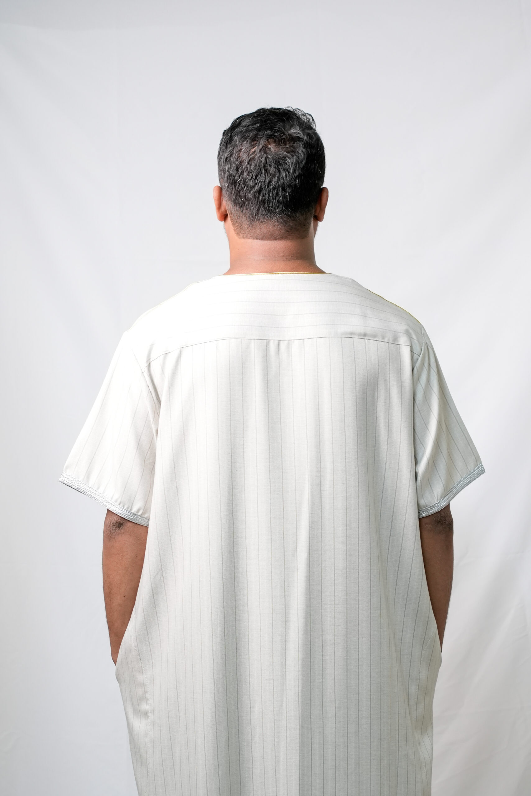 This classic Jalabiya features a light beige or off-white color, exuding understated sophistication. The fabric is adorned with subtle, vertical pin stripes in a contrasting darker shade, adding a touch of refined pattern without overpowering the garment’s traditional aesthetic.
