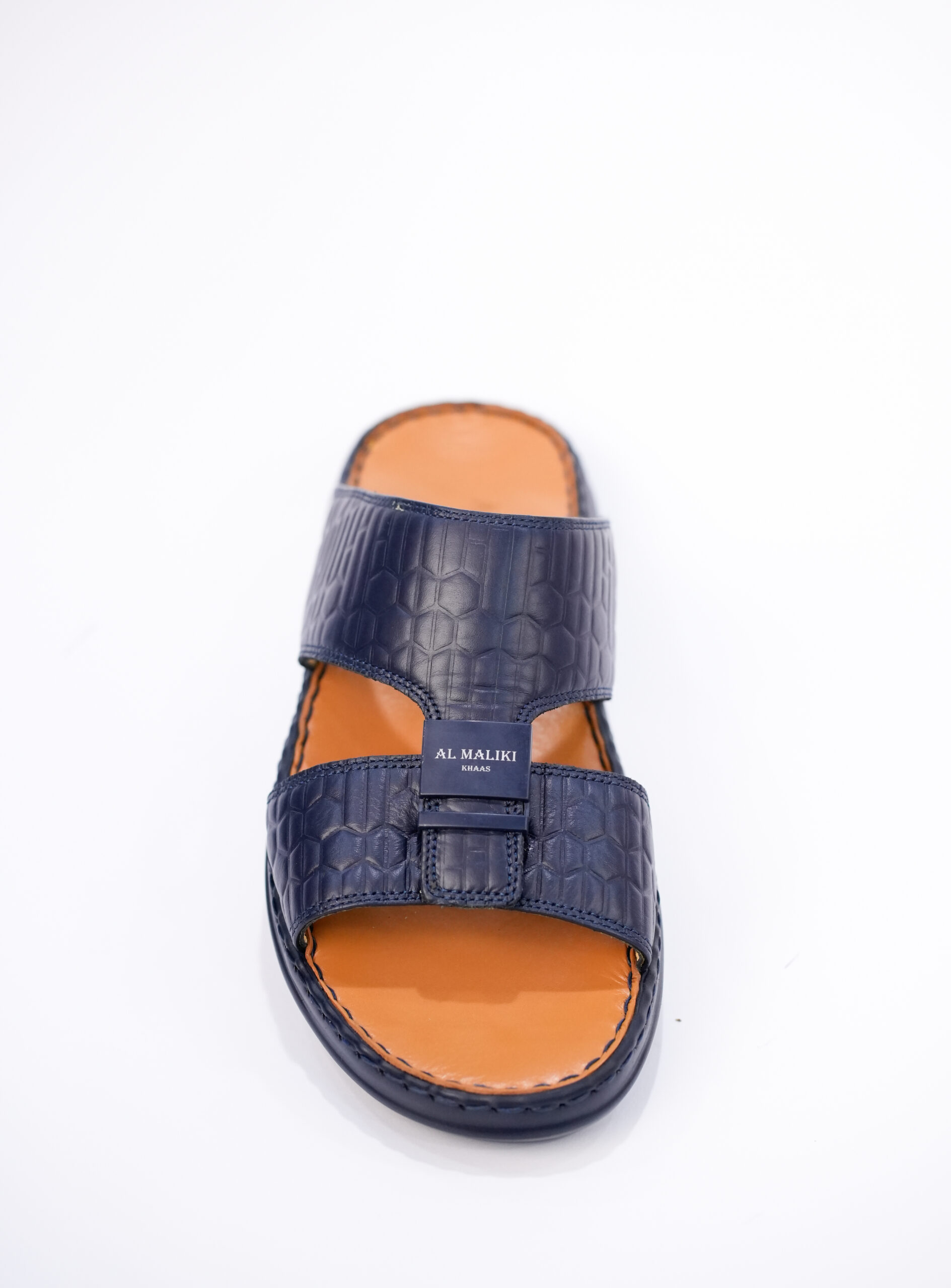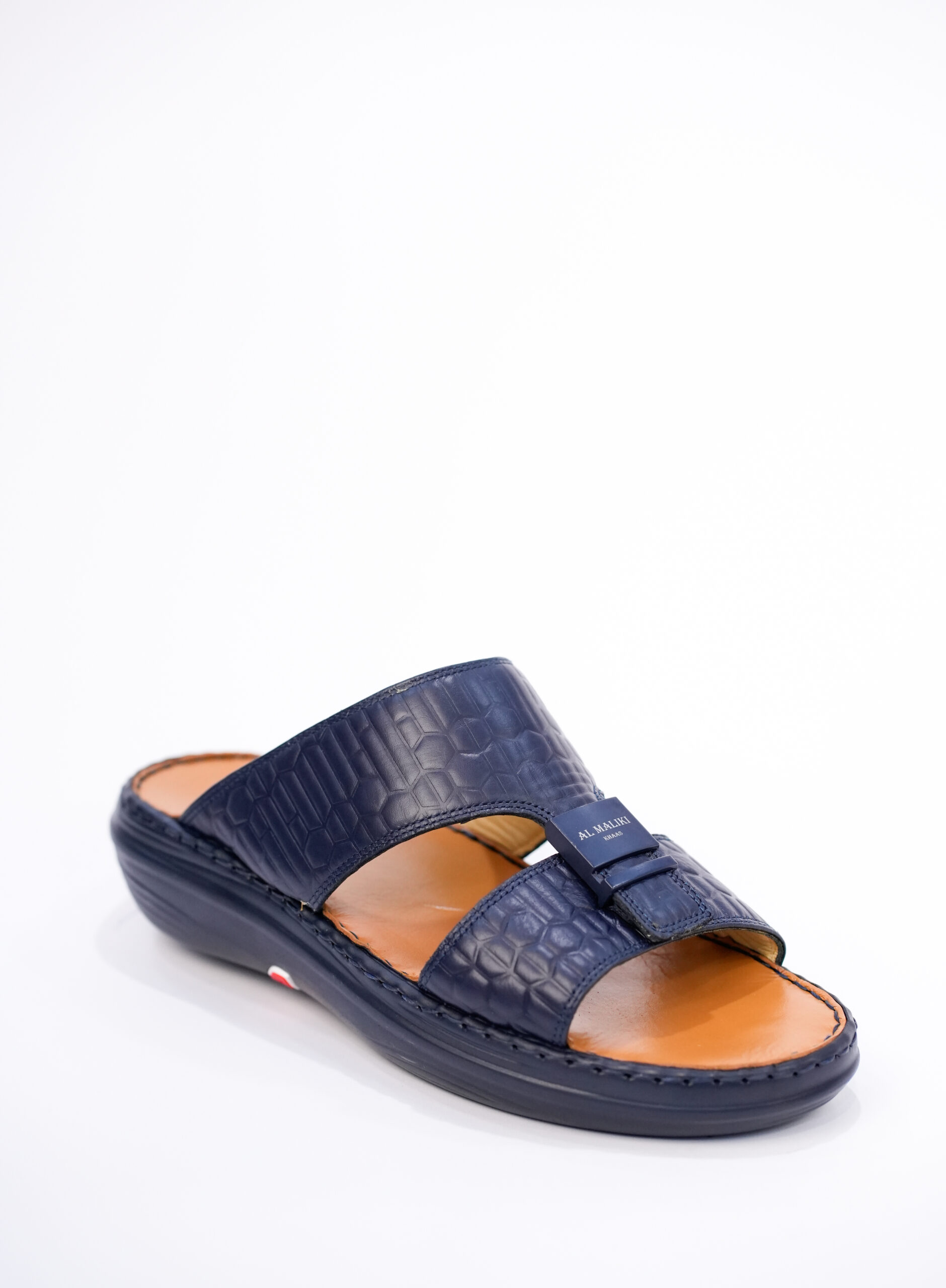 Experience refined comfort and heritage style with the Al Maliki Khaas Arabian Slippers, crafted for those who value tradition and elegance. These premium men’s slippers feature a navy blue genuine leather upper embossed with a hexagonal geometric pattern, offering a bold and modern interpretation of classic Arabian footwear.
